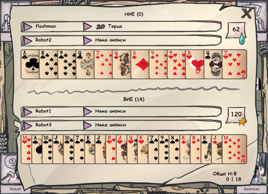 Общият брой на точките с последното 10 е: 258 (26) на "Всичко коз", 260 (26 след удвоявянето) на "Без коз" и 162 (16) при игра на коз.