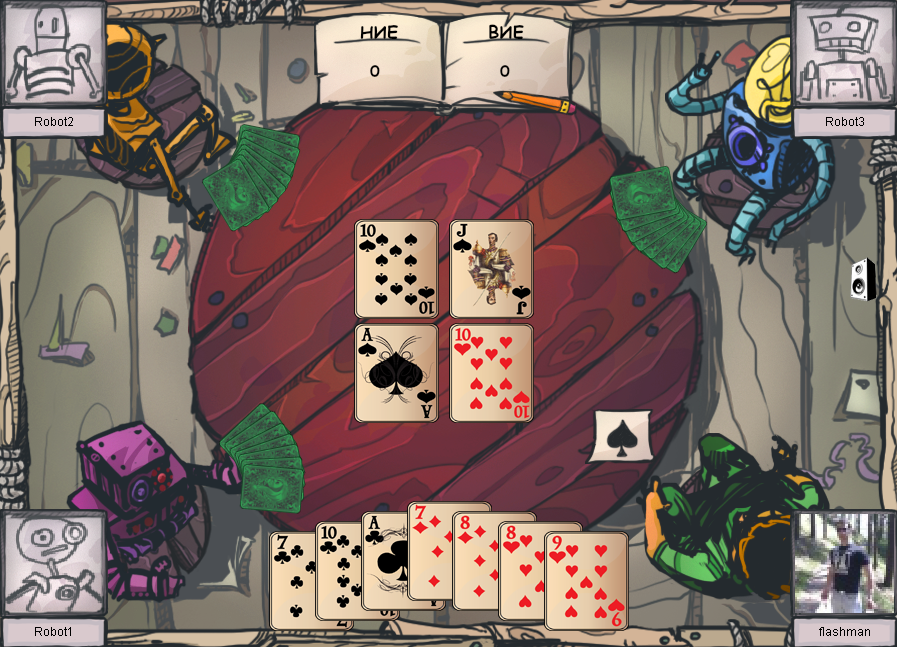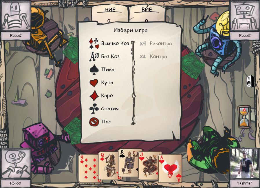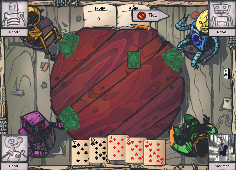 Играта започва седящият в дясно от раздаващия, като поставя една от своите карти на масата (тя определя "исканият" цвят). Всеки следващ играч поставя карта от същия цвят. Взятката (ръката) печели играчът който е поставил най-висока карта (или коз). Играчът, който е спечелил взятката събира картите, прибира ги при себе си (с лицето надолу) и започва следващият кръг, като играе произволна карта и т.н.